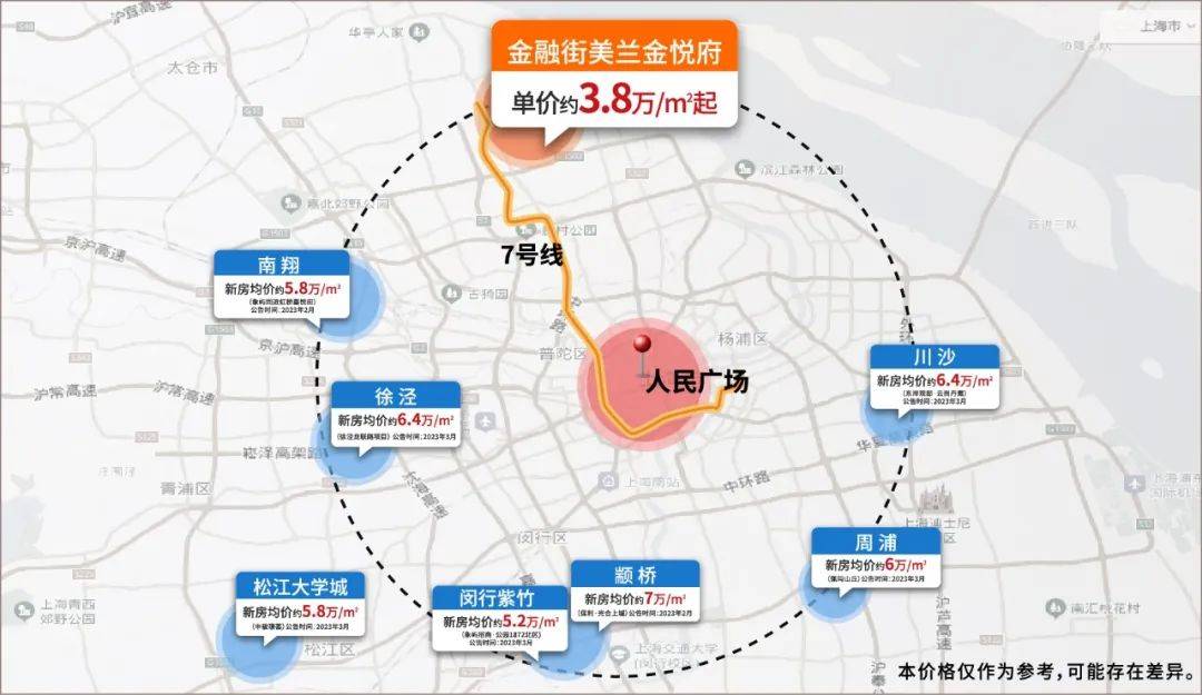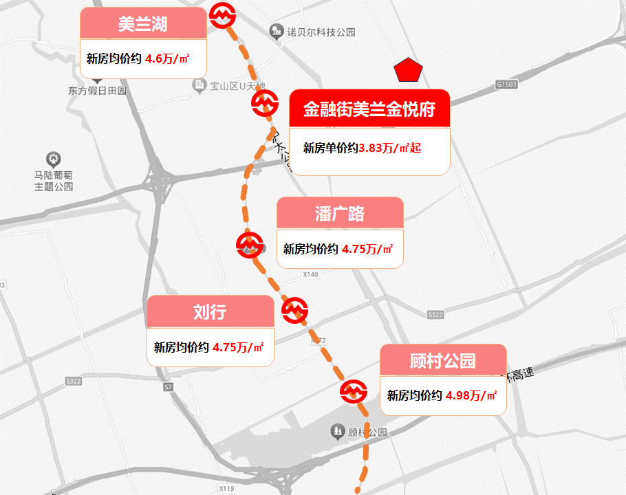 从7号线来说,往后一站的美兰湖,比金悦府贵了约8000元/㎡+,往前几站的潘广路、刘行和顾村公园,都比金悦府贵了1w/㎡上下!另一条南北大动脉1号线,杨行板块的新房均价达到了4.93w/㎡。